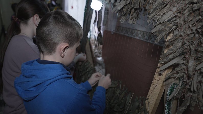 Директорка закладу Олена Катеринич розповіла нам, що плетіння кікімор та нашоломників у сільському ліцеї — це частина щоденної роботи. Школярі до неї долучаються на перервах та після уроків. За словами жінки, готові вироби передають волонтерам, а ті везуть їх захисникам.