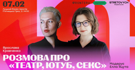 У суботу, 7 лютого, о 14:00 у Луцькому бізнес-просторі (вул. П’ятницька гірка, 2) відбудеться публічна розмова «Театр, ютуб, секс» за участі авторки однойменної книжки, теле- і радіоведучої, продюсерки та громадської діячки Ярослави Кравченко.