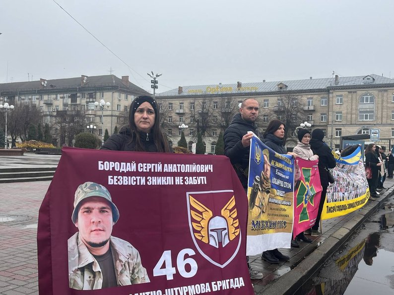 "Чоловік мій Роман зник безвісти на Бахмутському напрямку, вчора було рік і чотири місяці. З його бригадою нормально спілкуємось, на дзвінки нам відповідали. Нам сказали «Чекайте і вірте, що він в полоні. Тіла не знайшли». Вийшли з онуком Нікітою вдруге на акцію, йому скоро буде шість років, він теж сумує за дідусем", — розповіла пані Тетяна.
