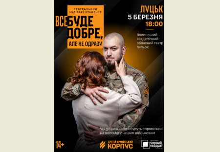 5 березня о 18:00 в Луцьк у Волинському академічному обласному театрі ляльок відбудеться мілібарі-стендап «Все буде добре, але не одразу» – трагікомедія про героїзм в простих речах, про справжнє кохання, чорний та білий гумор.