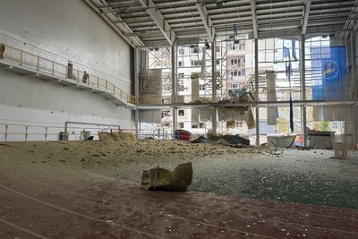 Вибита стіна у легкоатлетичному манежі СумДУ, Суми, 21 квітня 2026 року. Суспільне Суми
