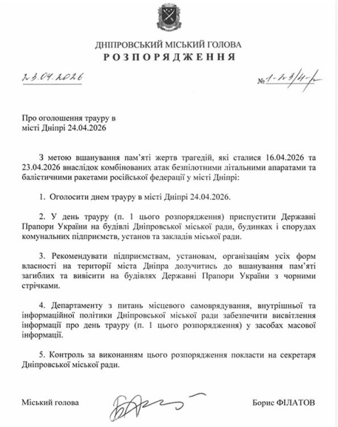 Завтра, 24 квітня 2026 року, в Дніпрі оголошено День жалоби за загиблими внаслідок останніх двох атак на місто – 16 та 23 квітня. Під час ударів рф вбила вісьмох містян.