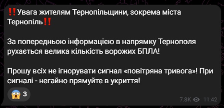 Об 11:59 попередження також опублікували в телеграм-каналі міського голови Тернополя Сергія Надала.
