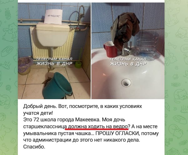 В соседней Макеевке ситуация еще более унизительная. В 72-й школе на туалете висит табличка “Не работает”, а вместо унитаза – пластиковое ведро. На фото, опубликованных в Телеграм-канале “Жизнь в ДНР”, видно, что старшеклассники вынуждены пользоваться именно им. В умывальнике пластиковая чашка и бутылка с остатками воды.