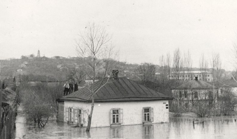 Знову 1942 рік. Люди очікують на порятунок на дах своїє хати. Полтава. Вдалині дзвінниця Святоуспенського собору. “Стара Полтава” Facebook