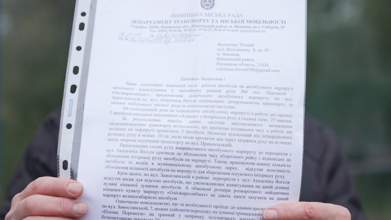 Вона розповіла, що муніципальний автобус — єдиний вид транспорту, який заїжджає до їхнього району, іншого сполучення немає. Він вивозить людей із мікрорайону до центральної дороги — на Немирівське шосе.