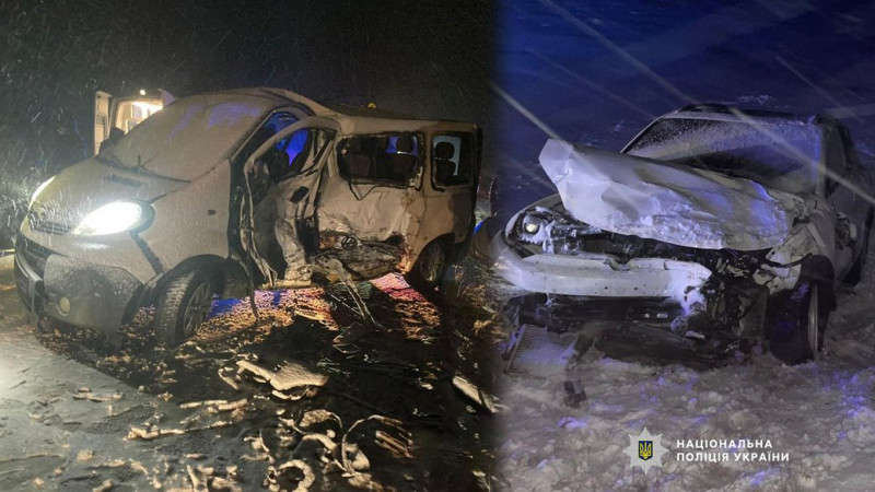 Наслідки зіткнення мікроавтобуса та легковика на Чернігівщині 15 лютого 2026 року. Поліція Чернігівської області