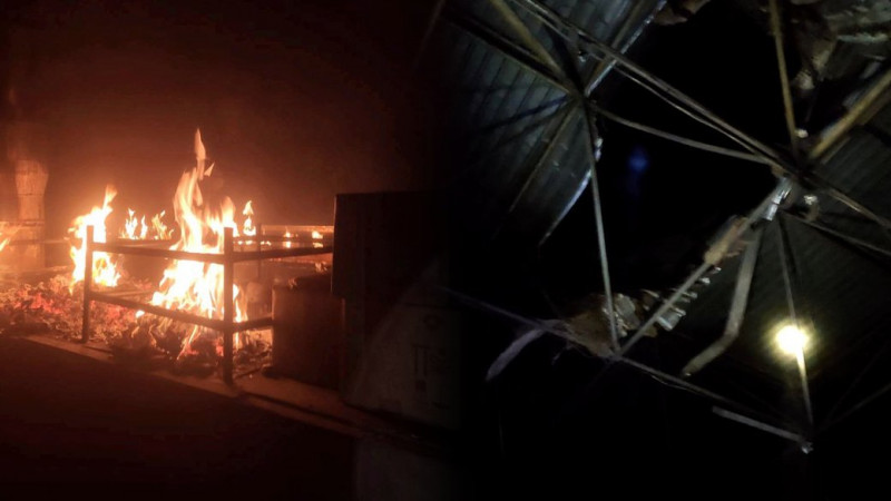 Вогонь від обстрілу та пошкоджене підприємство у Сновській громаді на Чернігівщині 24 грудня 2025 року. Корюківська районна військова адміністрація
