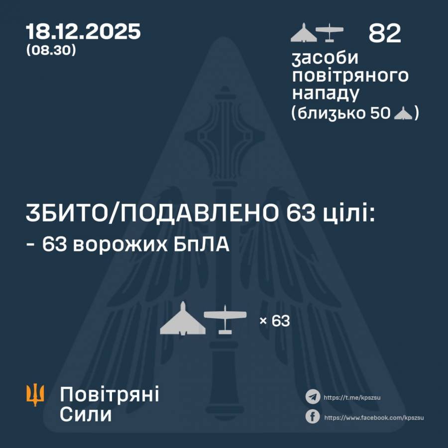 По информации Воздушных сил ВСУ, с вечера 17 декабря до утра 18 декабря РФ атаковала Украину 82 ударными БПЛА типов Shahed, “Гербера” и других модификаций. Силы обороны применили авиацию, зенитные войска, подразделения радиоэлектронной борьбы и мобильные огневые группы. Сбито или подавлено 63 БПЛА, однако зафиксированы попадания 19 дронов на 12 локациях, а также падение обломков на восьми.