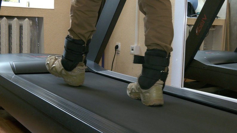 Військовослужбовець одягає обтяжувачі на ноги, кожен з яких вагою по 3 кілограми — і так ходить на біговій доріжці.