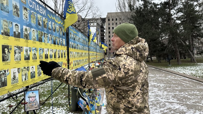 Ветеран Олександр Сєрков розглядає світлини товаришів на Алеї слави. Суспільне Миколаїв/Назарій Рубаняк