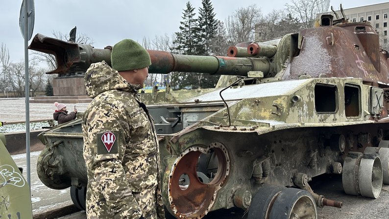 Ветеран Олександр Сєрков розглядає розбиту російську техніку. Суспільне Миколаїв/Назарій Рубаняк