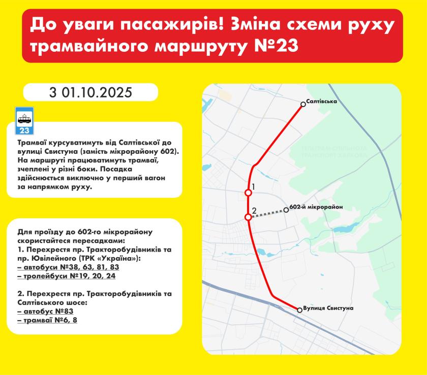 Трамвай №23 знову ходить на проспекті Тракторобудівників, але за зміненим маршрутом. Тепер трамвай курсує від Салтівського шосе до вул. Свистуна з інтервалом у 14 хвилин.