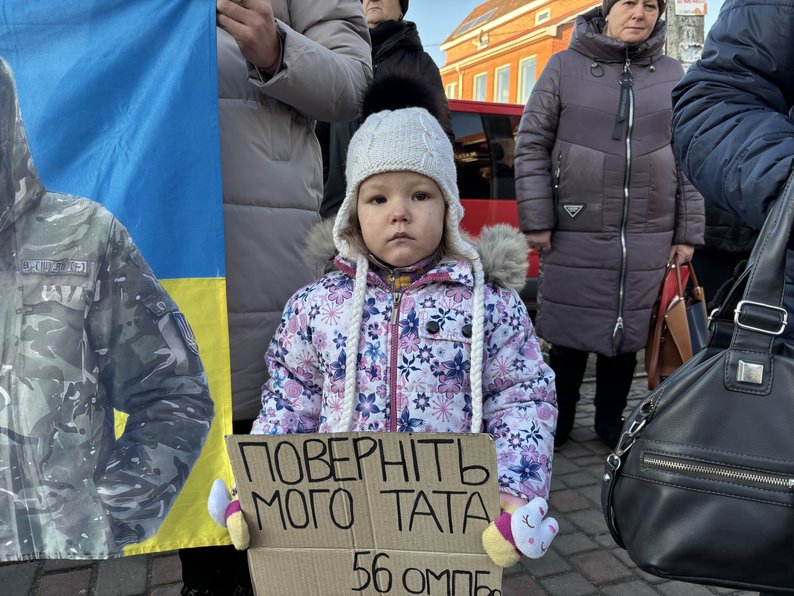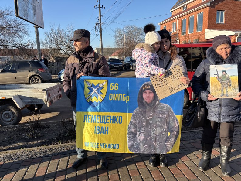 Рідні Івана Лемещенка на акції в Крижополі. Суспільне Вінниця/Майя Ковінчук"Я тут стою заради свого чоловіка. Для нас ці акції дуже важливі. Мій чоловік зник безвісти 25 лютого 2023 року. Ми чекаємо його з надією і любов’ю. Хочемо, щоб нас почули і повернули наших рідних — наших чоловіків, батьків наших дітей. Коханий, я знаю, що ти колись мене почуєш. Дуже люблю тебе і чекаю додому", — розказала дружина зниклого Івана Лемещенка Марина.