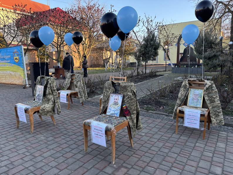 Також на локації облаштували експозиція на часть зниклих оборонців із Крижополя та громади — встановили порожні стільці із фотографіями захисників та їх військової формою.