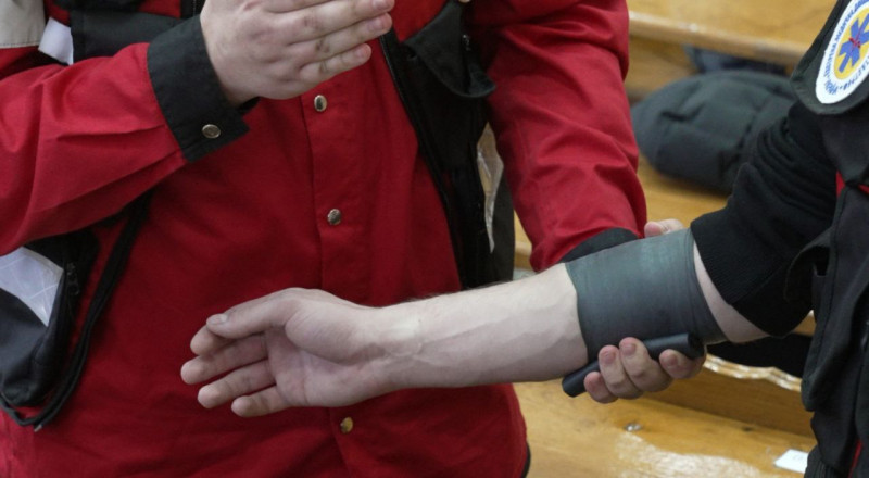 "Щоб його накласти, треба розтягнути матеріал до такої стадії, щоб прямокутники стали квадратами. Фіксуємо одну частину і починаємо дуже туго мотати, а потім перевіряємо місце кровотечі", — пояснив особливості накладання турнікета Ігор.