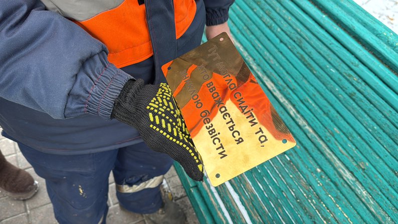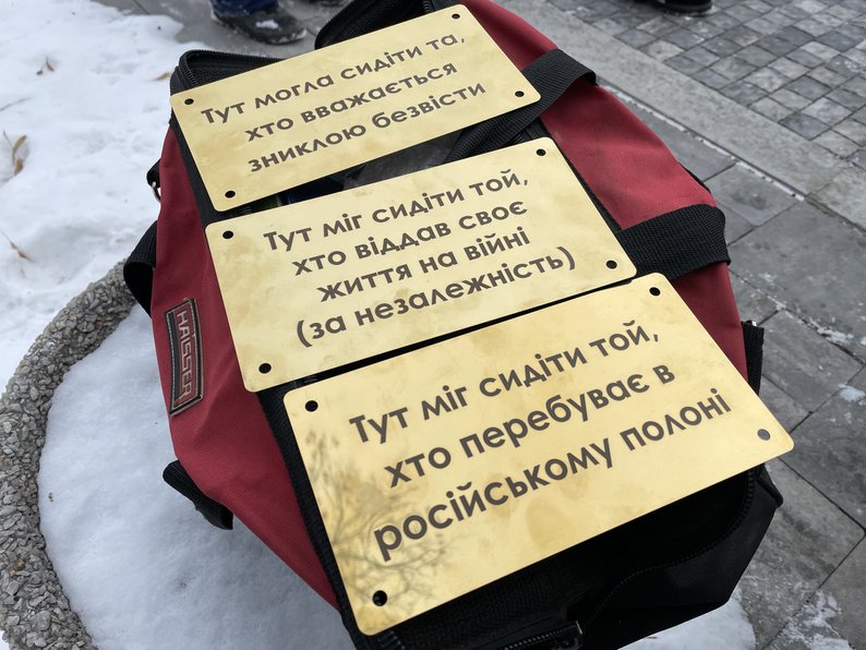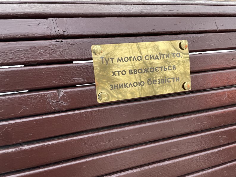 "Це маленькі таблички, розміщені на лавках, на яких написано: «Тут міг/могла сидіти той/та, хто зараз перебуває в полоні, хто загинув під час оборони нашої країни». Кілька жінок захотіли так популяризувати культуру пам’яті, і вони знайшли, хто розробить ці таблички. Загалом десь рік ми працювали над цим", — розповіла координаторка акції-нагадування про хвилину мовчання ГО "Вшануй" Руслана Холоша.
