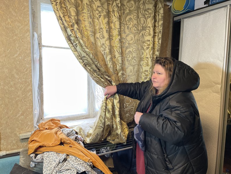 "Оце вікна моєї квартири. Шість вікон, і всі вони посипалися. Одне-єдине тільки залишилося. І з того боку на другому поверсі теж два вікна. Це було десь близько другої години ночі. Я була в кухні, тому що була вода, трішки хотіла (набрати, — ред.). Стояла якраз у кухні біля вікна. У залі плафон люстри злетів, вдарилася у вікно, вибила вікно, назад упала в залі, не розбилася. Температура низька, дуже низька. Дуже холодно. Ще й був вітер зараз і цілу ніч", — сказала мешканка пошкодженого будинку Тетяна Риндяк.