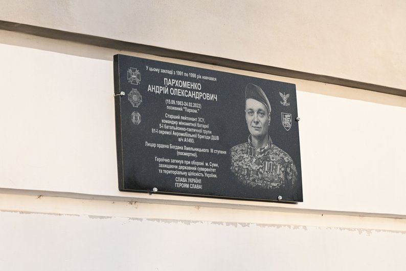 На фасаді Полтавської школи №22 відкрили меморіальну дошку військовослужбовцю Андрію Пархоменку, який поліг в перші дні повномасштабного вторгнення на Сумщині.