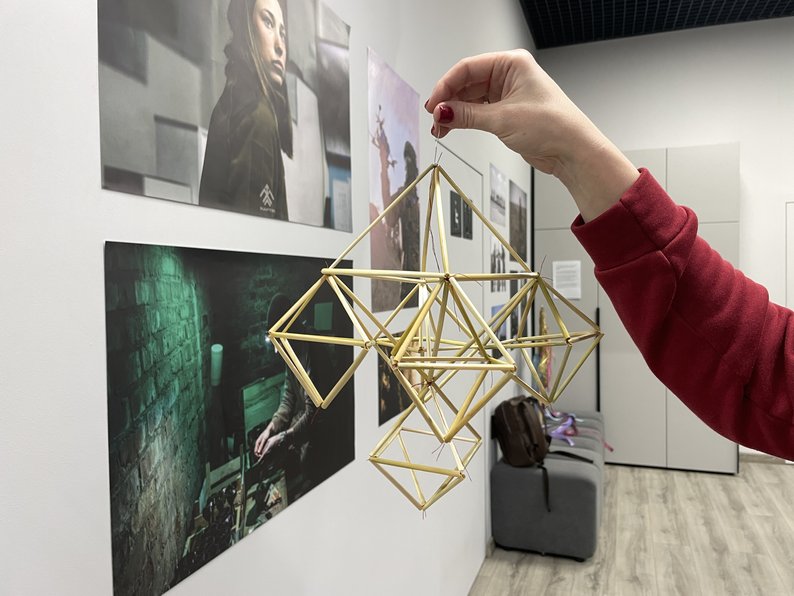 "Проводимо цю ниточку в кожну соломинку, дивіться. Ось вона виходить. І так робимо перші чотири соломинки. Складається з одного великого ромба. По краях вішаємо п’ять ромбів по сім сантиметрів", — розповіла волонтерка Олена Грінченко.