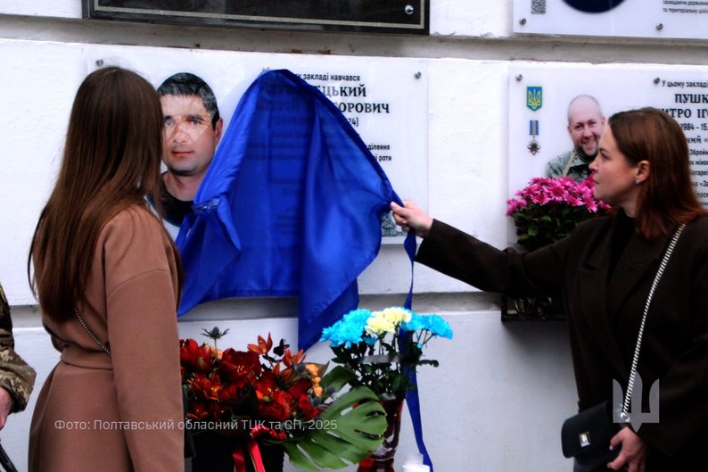 Меморіальну дошку відкрили дружина та донька полеглого воїна Валерія Луб’янецького. Фото: Facebook/Полтавський обласний ТЦК та СП