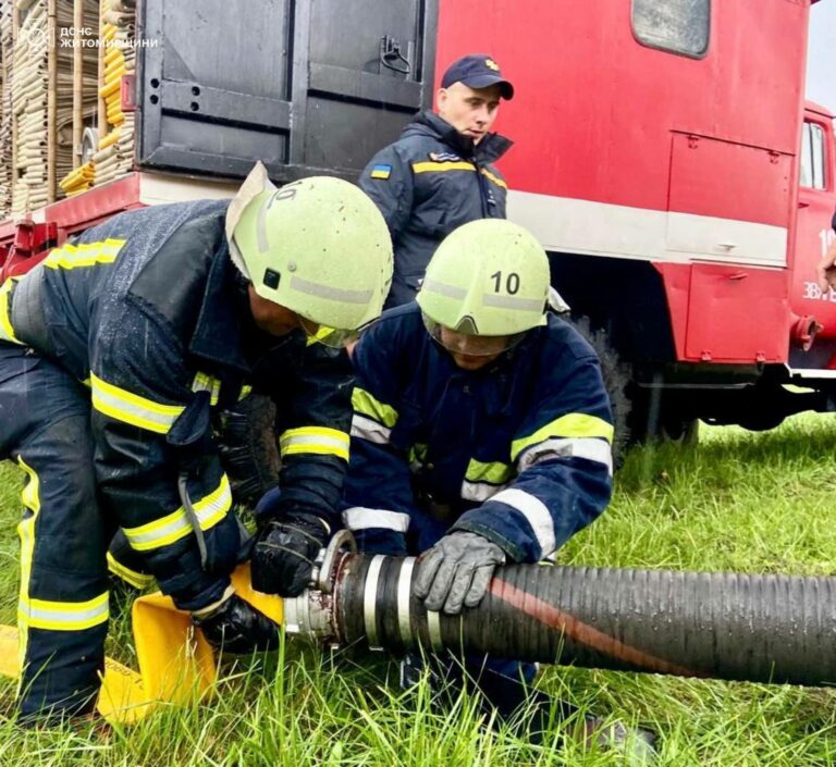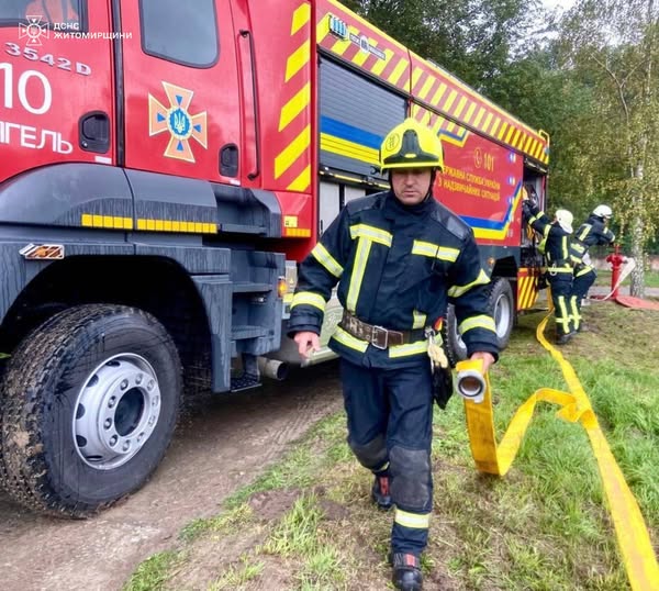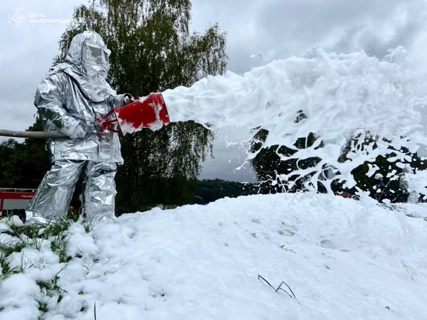 Під час тренувань ГУ ДСНС у Житомирській області відпрацювали гасіння масштабної пожежі із розливом нафтопродуктів, що виникла внаслідок ракетного удару.
