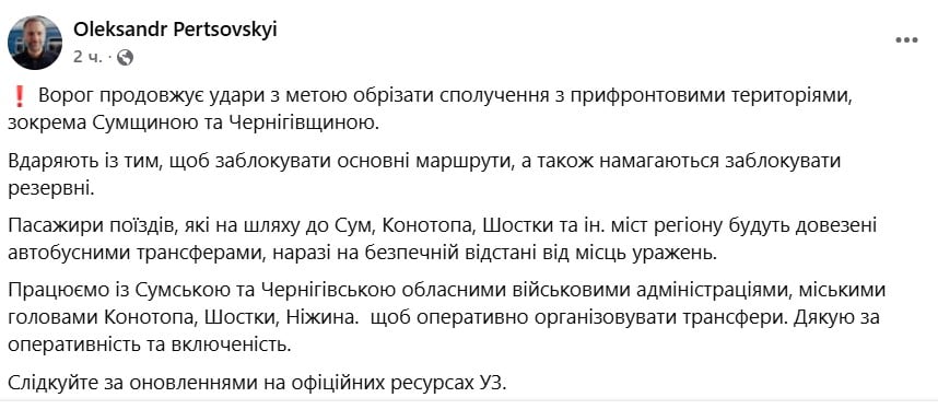 Перцовский добавил, что пассажиров поездов, следующих в Сумы, Конотоп, Шостку и другие города региона, доставят автобусными трансферами.