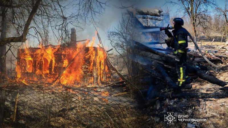 Колаж, на якому пожежа будинку на Чернігівщині внаслідок удару російського безпілотника 27 березня 2026 року та вогнеборець гасить займання. Головне управління ДСНС у Чернігівській області