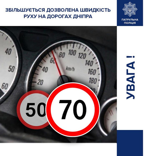 Як повідомили у Патрульній поліції, відповідно до рішення виконавчого комітету Дніпровської міської ради, у період з 1 квітня до 1 листопада 2026 року дозволена швидкість руху на певних ділянках буде збільшена до 70 км/год.