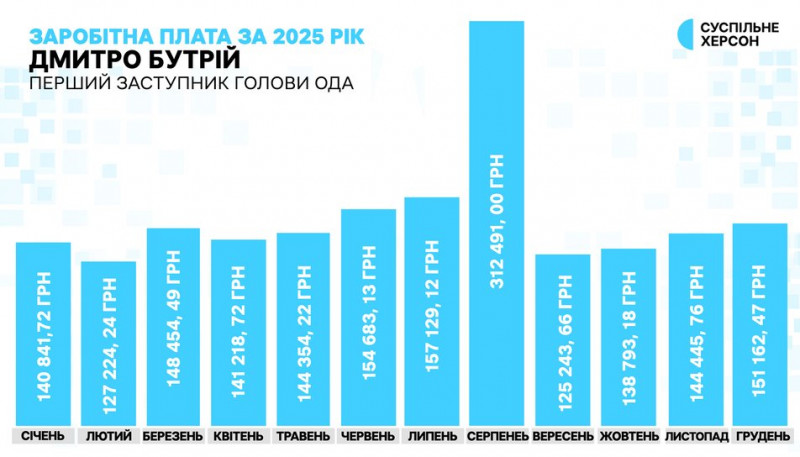 Перший заступник керівника Херсонської ОВА Дмитро Бутрій у 2025 році заробив понад мільйон 880 тисяч гривень. Найбільшу виплату він отримав у серпні 312 491 гривню, найменшу у вересні — 125 244 гривень.
