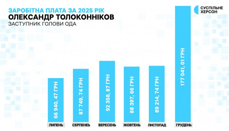 Заробітна плата заступника керівника Херсонської облдержадміністрації Олександра Толоконнікова за 2025 рік помісячно. Інфографіка Суспільне Херсон