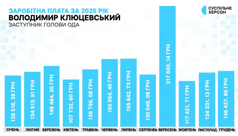 Заробітна плата заступника керівника Херсонської облдержадміністрації Володимира Клюцевського за 2025 рік помісячно. Інфографіка Суспільне Херсон