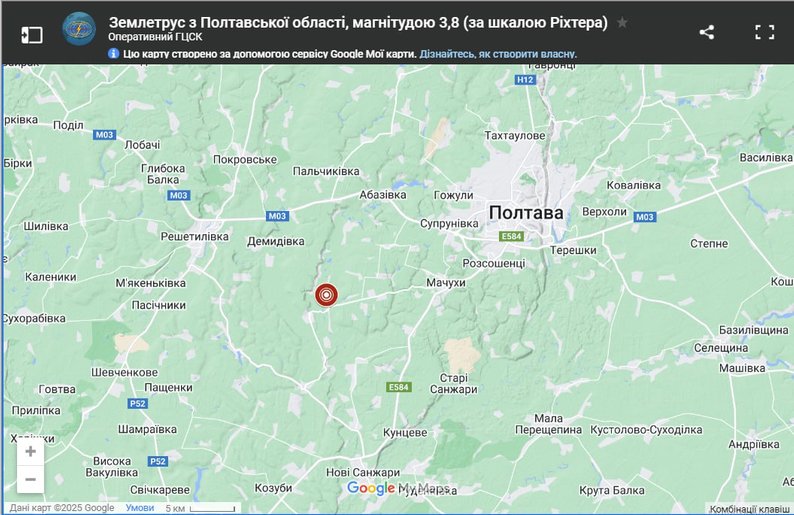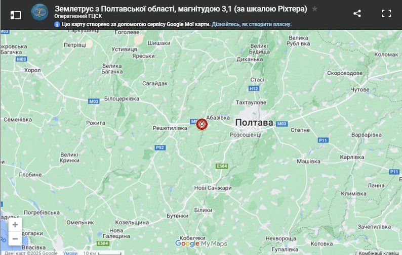 Землетрус 16 лютого 2025 року на Полтавщині. Скриншот із сайту Головного центру спеціального контролю