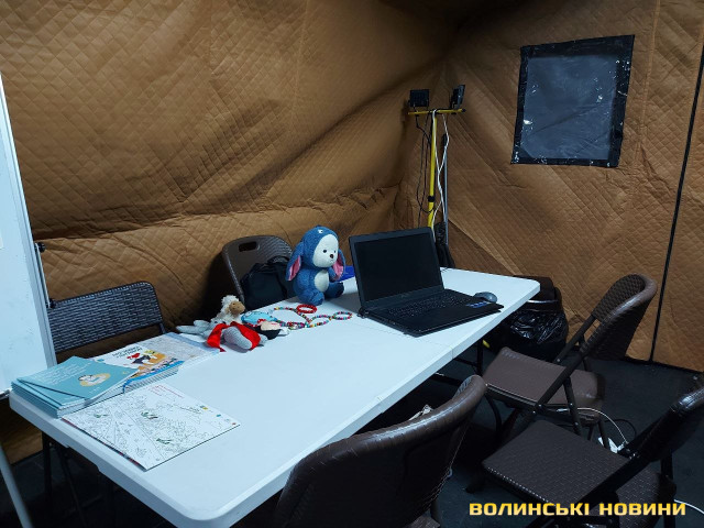 У наметі – тепло. Є чиста вода, чайники, щоб заварити чаю чи кави, смаколики й навіть кілька баночок варення. Тут достатньо стільців, пледів. Для дітлахів завбачливо приготували чимало іграшок та розмальовок.