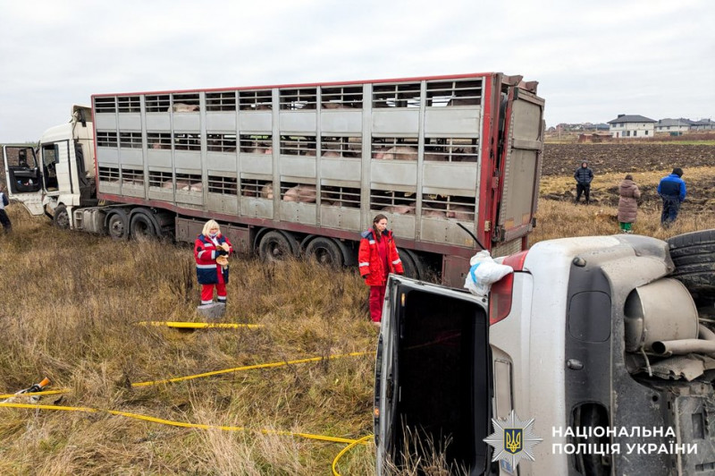 "Попередньо встановлено, що водій автомобіля BMW X5, 55-річний житель Колоденки, виїхав на зустрічну смугу, де допустив зіткнення із вантажівкою DAF, яка була завантажена тваринами. Від удару обидва транспортні засоби злетіли у кювет, а позашляховик — ще й перекинувся", — поінформувала Марія Юстицька.