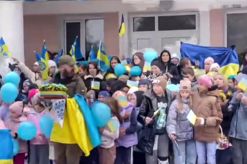 Місцеві зустріли військового з прапорами України. Йому вручили коровай ти синьо-жовтий стяг. Чоловіка обіймали та дарували квіти.